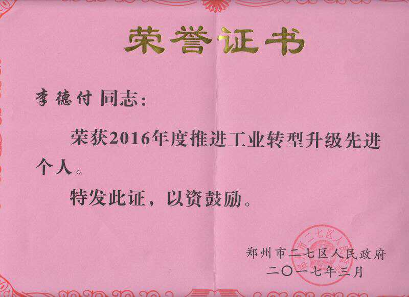 熱烈慶祝 華中食品李德付同志榮獲2016年度推進(jìn)工業(yè)轉(zhuǎn)型升級先進(jìn)個人,受到鄭州市二七區(qū)人民政府以政府公文的形式進(jìn)行高度的宣傳,表彰!我們衷心的向李總表示祝賀!