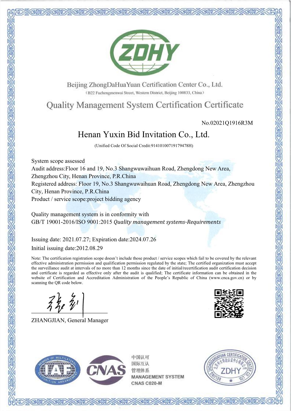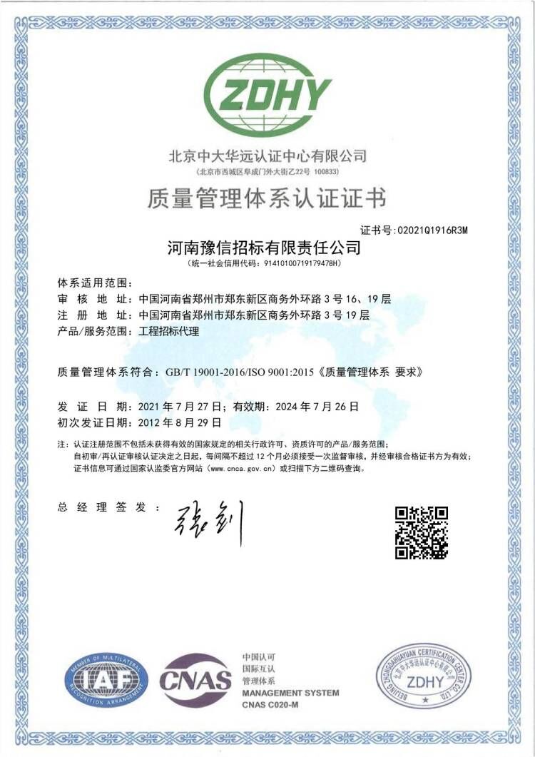河南豫信招標(biāo)有限責(zé)任公司QMS質(zhì)量管理系體認(rèn)證證書(shū)中文 -