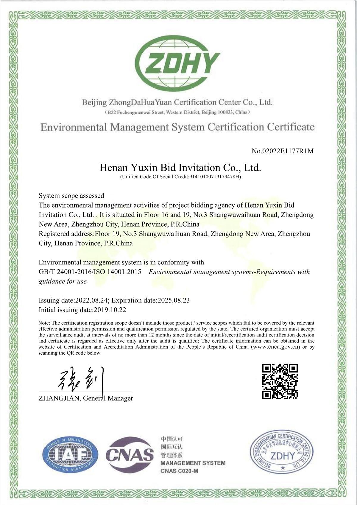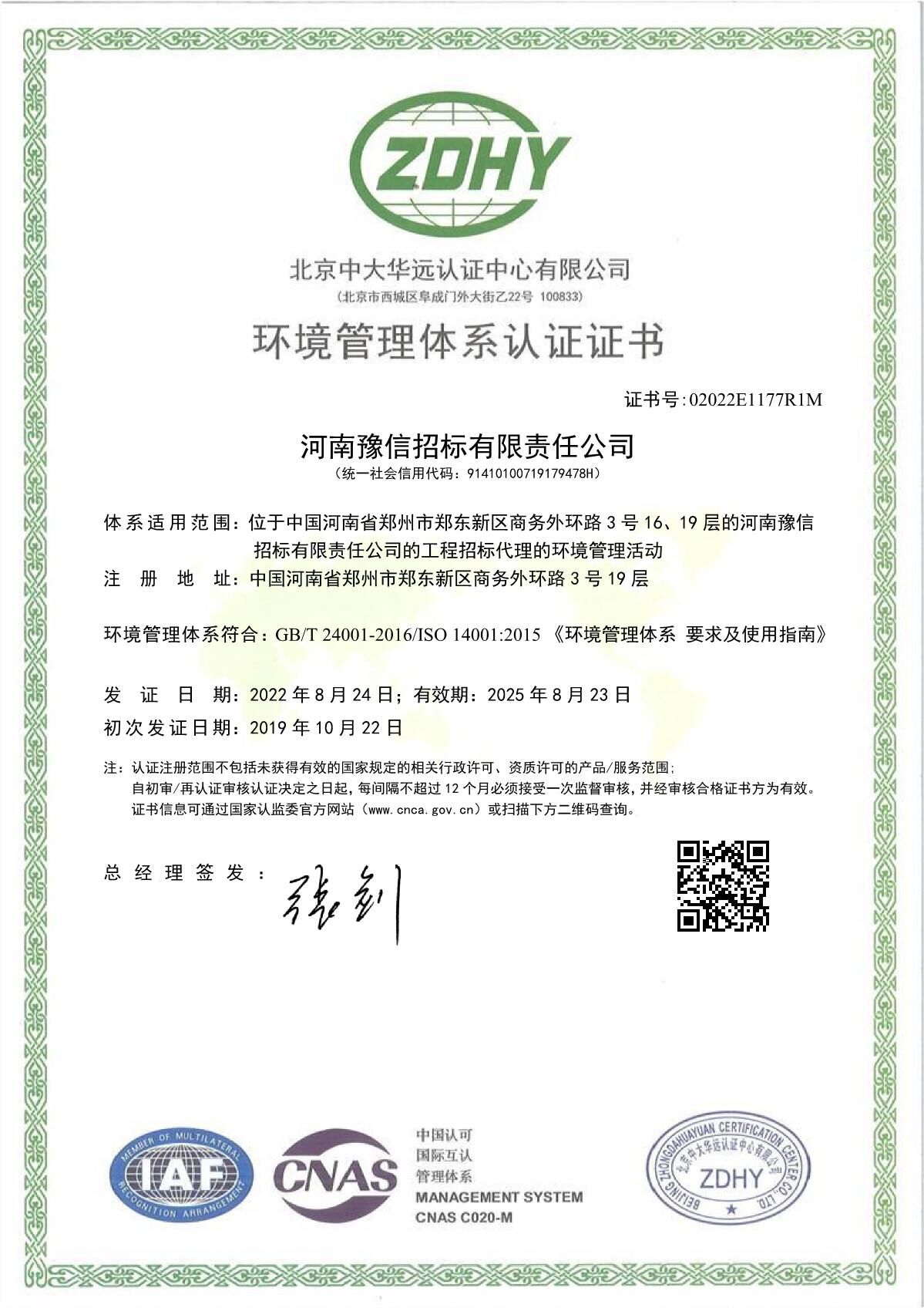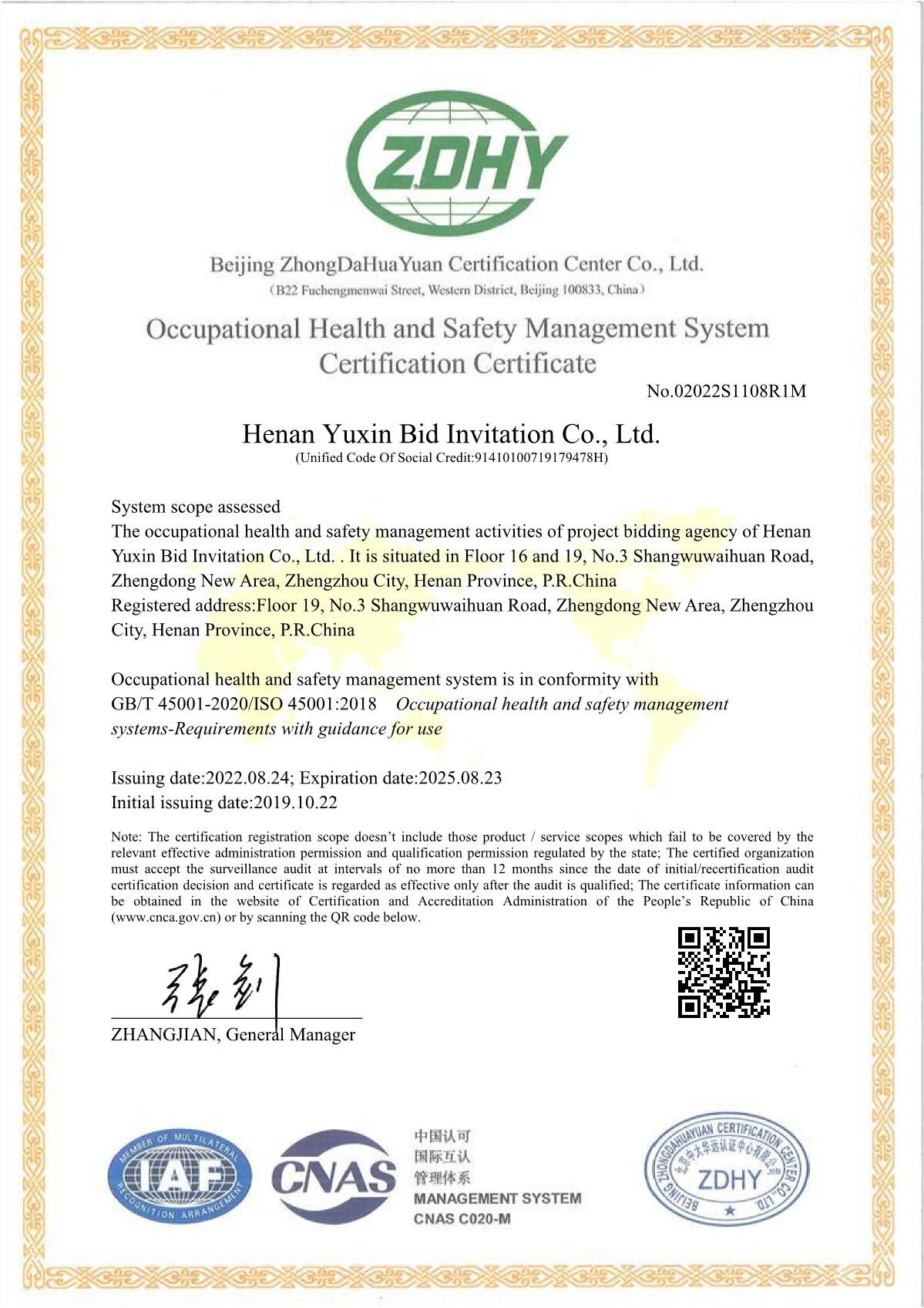河南豫信招標(biāo)有限責(zé)任公司OHSMSSMS中文證書(shū) -