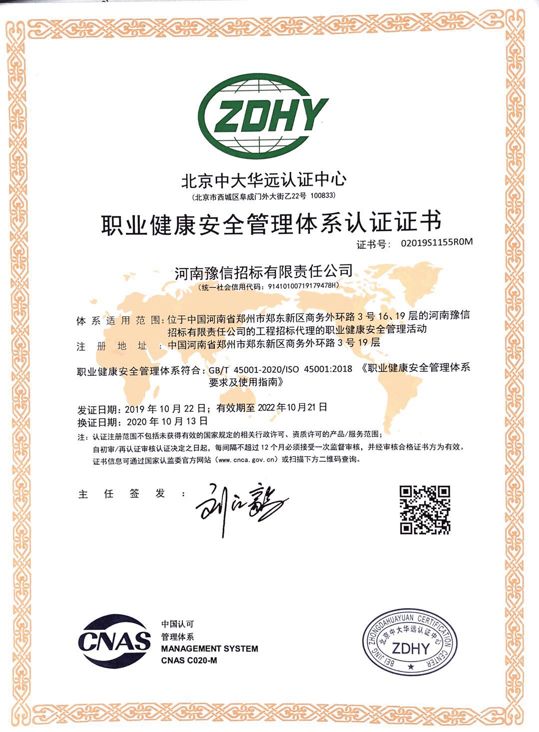 職業(yè)健康安全管理體系認證證書 -