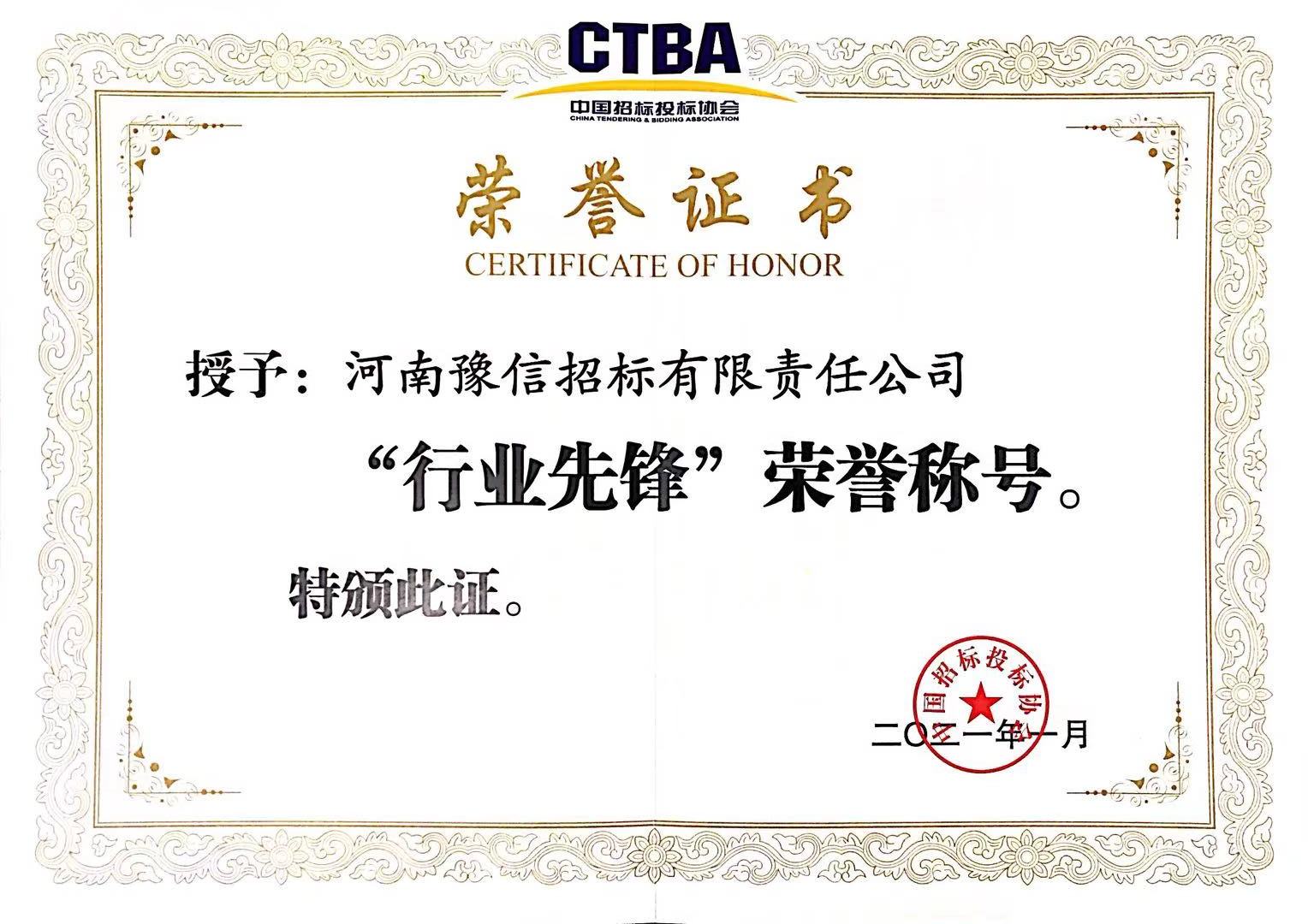 “行業(yè)先鋒”榮譽證書 -