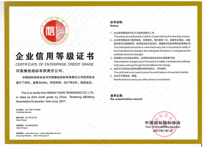 中國招投標協(xié)會3A企業(yè)信用等級證書