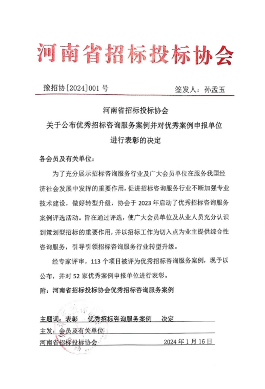 ?? ? 1 月 16 日,河南省招標投標協(xié)會公布了優(yōu)秀招標咨詢服務(wù)案例并對優(yōu)秀案例申報單位進行表彰。河南豫信招標有限責(zé)任公司申報的開封綜合報稅區(qū)建設(shè)項目全過程工程咨詢、鄭州中滎城市更新有限公司滎陽市 “ 鄭上文脈活力帶 ” 城市更新項目鄭上路道路改造提升及 15 分鐘生活圈工程、信陽市出山店供水工程項目 EPC 總承包、河南林州弓上抽水蓄能電站施工供水工程項目、河南省大數(shù)據(jù)管理局一體化協(xié)同辦公平臺項目,被評為優(yōu)秀招標咨詢服務(wù)案例。