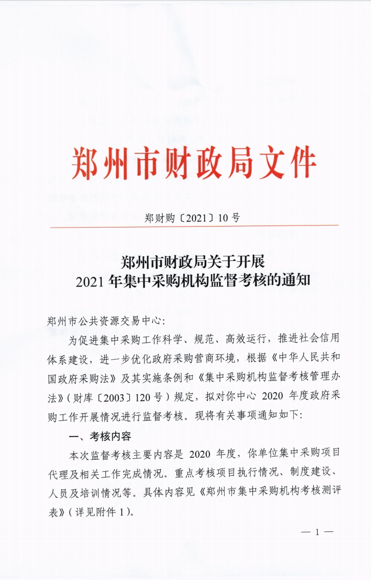 鄭州市財(cái)政局 關(guān)于開展2021年集中采購機(jī)構(gòu)監(jiān)督考核的通知