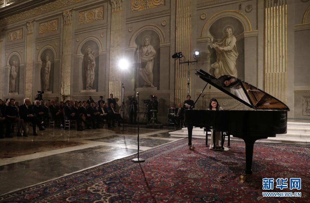 2020年2月13日,在意大利羅馬總統(tǒng)府奎里納萊宮,旅意華人鋼琴家居覲在音樂會現(xiàn)場演奏。當(dāng)日,由意大利總統(tǒng)馬塔雷拉提議,在2020年中意文化旅游年計(jì)劃外加演的一場鋼琴獨(dú)奏音樂會在意大利總統(tǒng)府舉行,向抗擊新冠肺炎疫情的中國人民傳達(dá)友誼和支持。新華社記者 程婷婷 攝