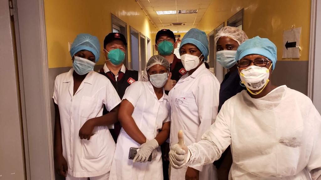 2020年5月26日,中國抗疫醫(yī)療專家組在剛果(布)首都布拉柴維爾指導(dǎo)新冠肺炎病房建設(shè)時,與當(dāng)?shù)匾痪€醫(yī)務(wù)人員合影。