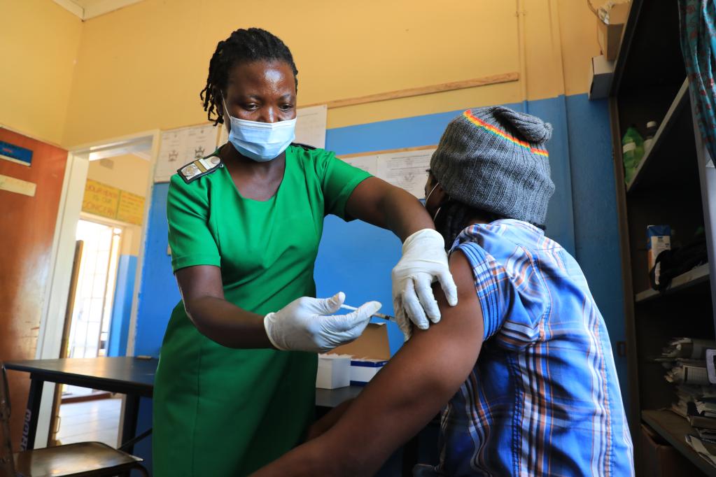 2021年2月22日,醫(yī)務(wù)工作者在津巴布韋中部省戈奎的醫(yī)院內(nèi)為當(dāng)?shù)鼐用窠臃N中國國藥集團(tuán)新冠疫苗。