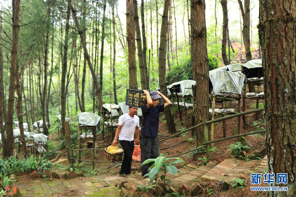 當?shù)厝罕娫谫F州省六盤水市六枝特區(qū)月亮河鄉(xiāng)的花德河國有林場內(nèi)收獲菌類(2021年7月24日攝)。 新華社發(fā)(令狐榮駿 攝)