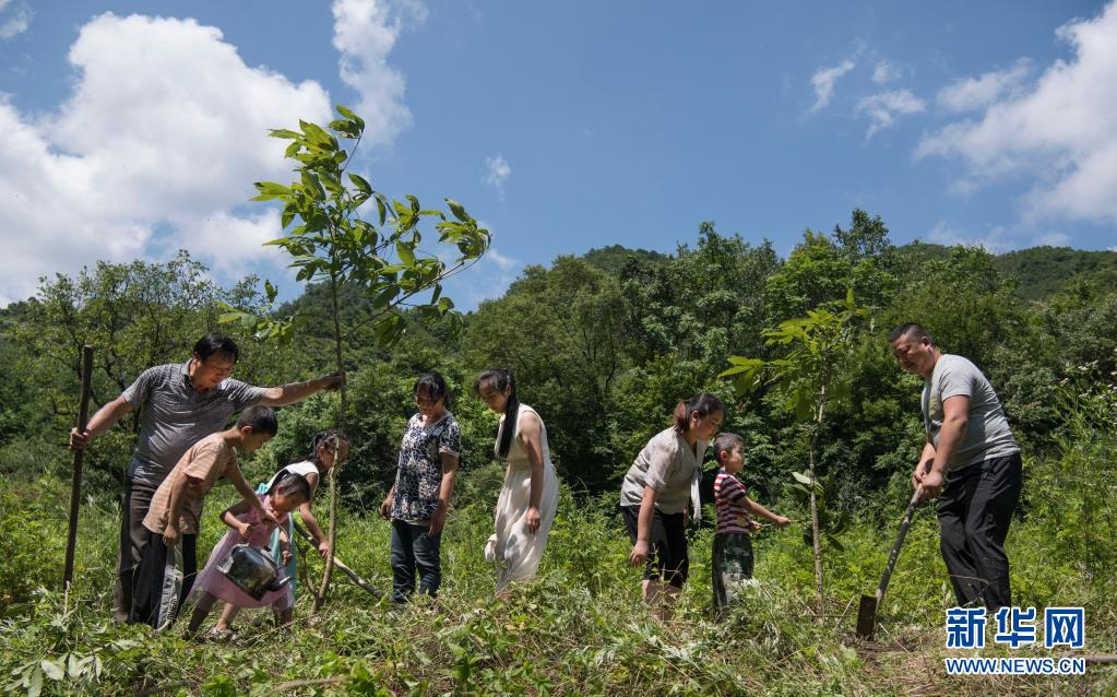 姚祖元(右一)與家人一起種樹(2019年7月13日攝)。在秦嶺深處的陜西省漢中市留壩縣火燒店鎮(zhèn),姚家5代人歷時70年深耕秦嶺的故事在當?shù)丶矣鲬魰?,傳為佳話?/span> 新華社記者 陶明 攝