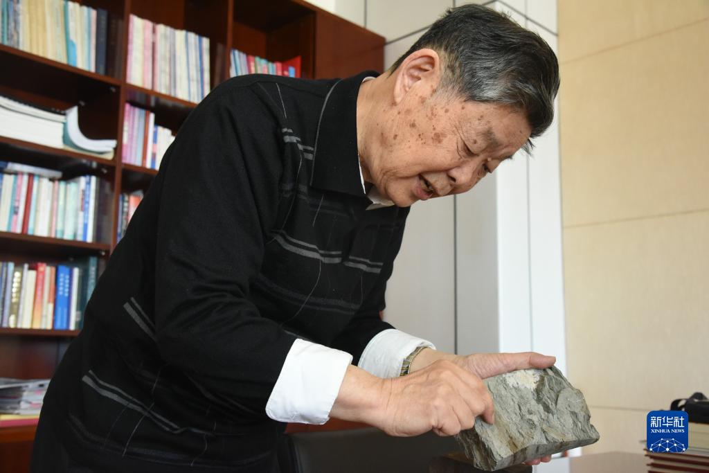 大慶油田第二代“鐵人”王啟民在辦公室手持巖心樣本介紹采油技術(shù)的發(fā)展情況(2021年2月25日攝)。新華社記者 楊喆 攝