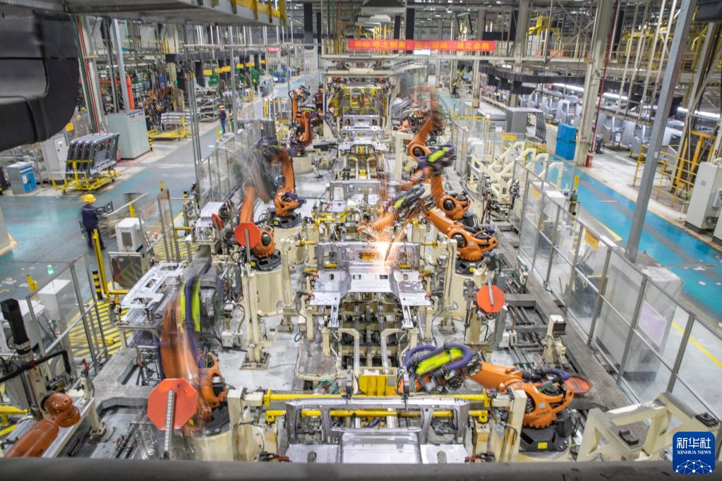 4月2日,在重慶上汽依維柯紅巖商用車有限公司焊裝車間,機器人在進行焊接作業(yè)。新華社記者 黃偉 攝
