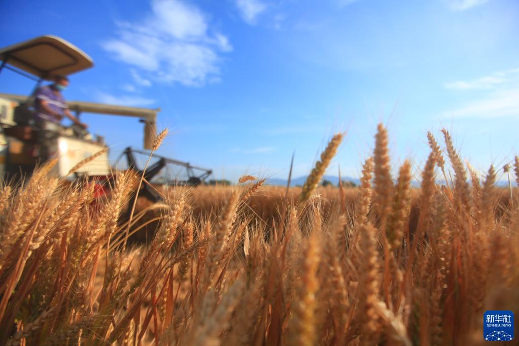 收割機在山東省臨沂市平邑縣的麥田里收割小麥(6月8日攝)。新華社發(fā)(武紀全 攝)
