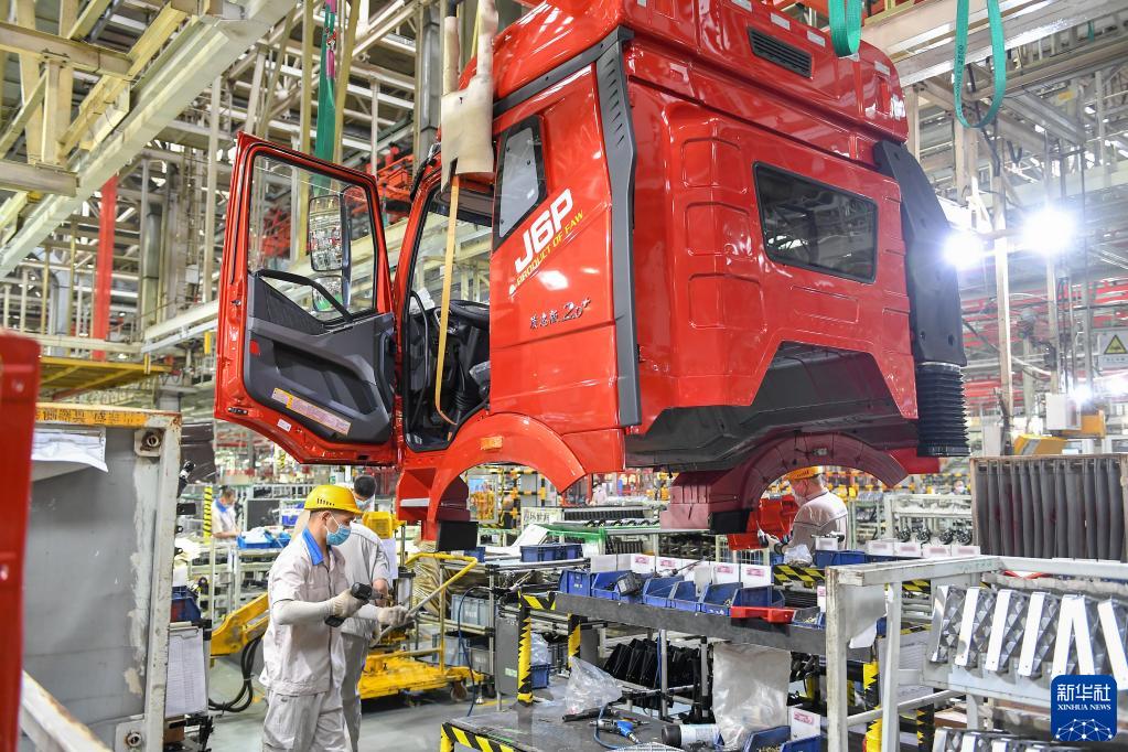 工人在位于長春的一汽解放總裝車間裝配車輛(7月7日攝)。新華社記者 張楠 攝