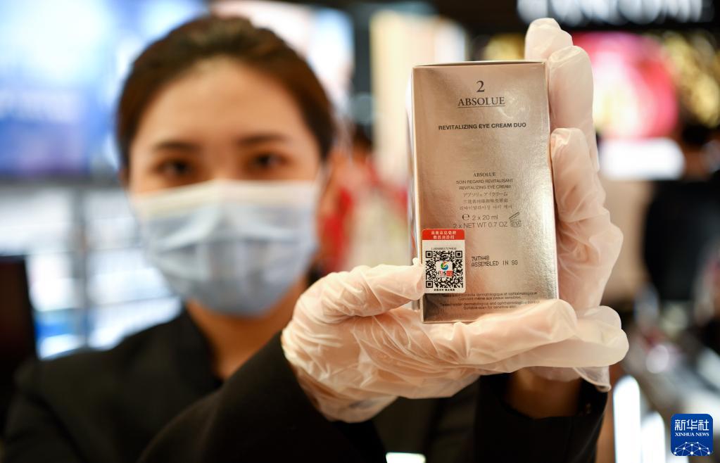 7月31日,??谌赵聫V場免稅店工作人員展示加貼溯源碼的商品。新華社記者 郭程 攝