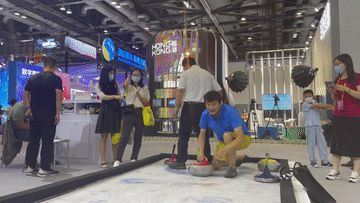 在奧地利展廳,一個小型冰壺場吸引眾人關注,不時有參觀者體驗。