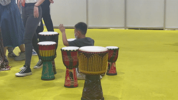 小朋友在服貿會現(xiàn)場體驗擊鼓