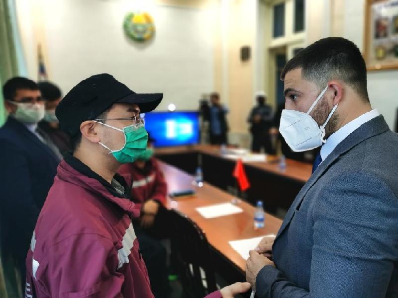 2020年4月20日,在烏茲別克斯坦費(fèi)爾干納州,肯熱巴耶夫(右)與中國政府聯(lián)合醫(yī)療工作組成員交流。