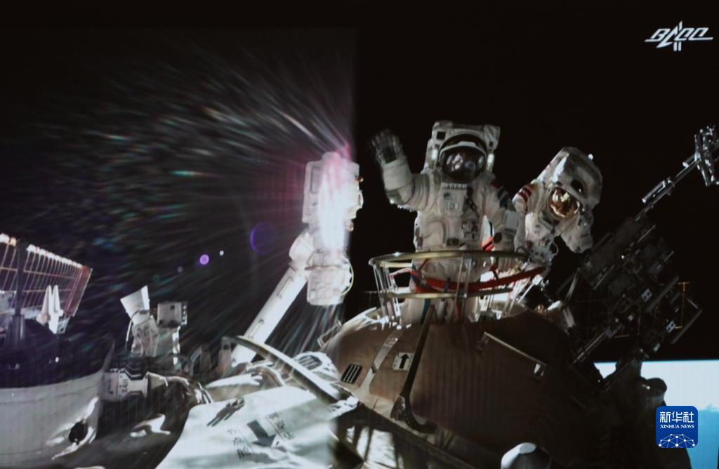 8月20日在北京航天飛行控制中心大屏拍攝的神舟十二號(hào)乘組航天員在艙外工作場(chǎng)景。新華社記者 田定宇 攝