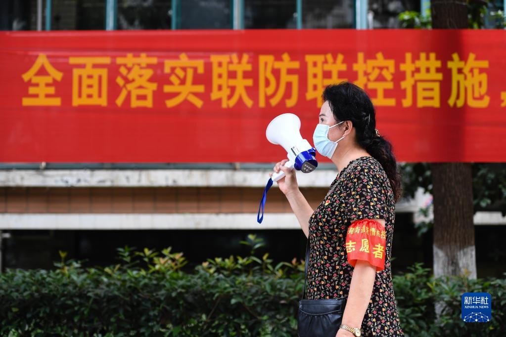 8月10日,在南京市建鄴區(qū)南苑街道吉慶家園小區(qū),志愿者馬維珍提示下樓活動(dòng)的居民不要聚集扎堆。新華社記者 季春鵬 攝
