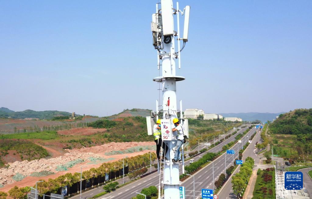 工作人員在位于重慶高新區(qū)高新大道的5G基站建設(shè)現(xiàn)場(chǎng)作業(yè)(2020年4月15日攝,無人機(jī)照片)。新華社記者 王全超 攝
