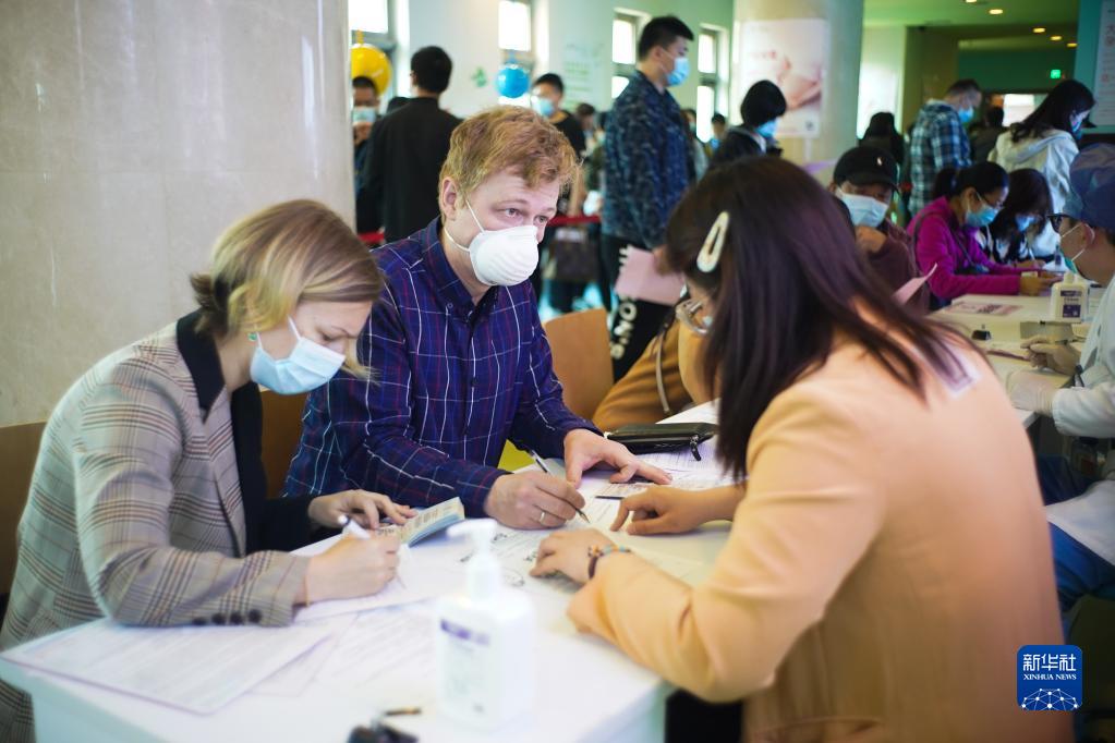 4月15日,在位于北京經(jīng)濟(jì)開發(fā)區(qū)的一處新冠疫苗接種點(diǎn),外籍人士接種新冠疫苗前填寫個(gè)人信息。新華社記者 彭子洋 攝