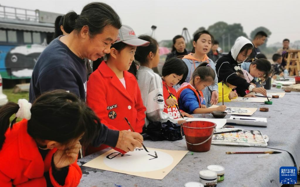 10月31日,許國良(左二)在湖南省益陽市資陽區(qū)張家塞鄉(xiāng)富民村為當(dāng)?shù)亓羰貎和厦佬g(shù)課。新華社發(fā)(孫國基攝)