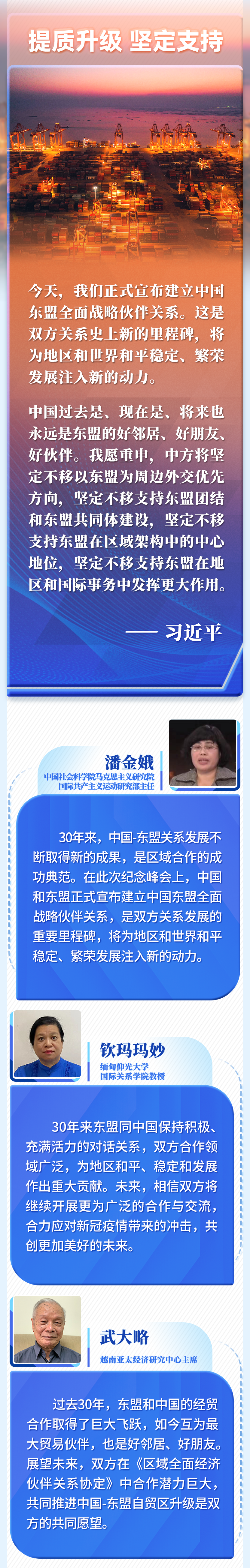 ? 國(guó)家主席習(xí)近平22日在北京以視頻方式出席并主持中國(guó)-東盟建立對(duì)話關(guān)系30周年紀(jì)念峰會(huì),發(fā)表重要講話。多國(guó)人士認(rèn)為,習(xí)近平主席的重要講話回顧30年來(lái)中國(guó)-東盟關(guān)系發(fā)展的重要成就和寶貴經(jīng)驗(yàn),為構(gòu)建更為緊密的中國(guó)-東盟命運(yùn)共同體擘畫藍(lán)圖,為共創(chuàng)更加繁榮美好的地區(qū)和世界注入新的強(qiáng)大動(dòng)力。