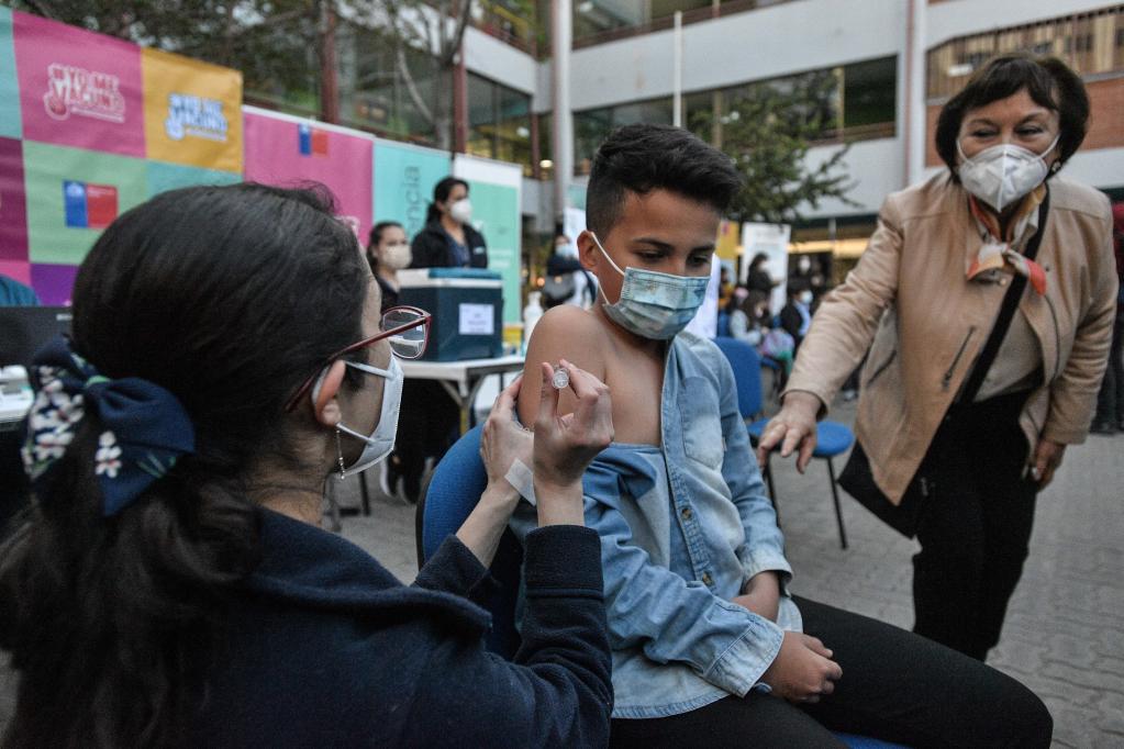 2021年9月27日,一名兒童在智利首都圣地亞哥接種科興新冠疫苗。27日起,智利開始對6歲至11歲在校學生接種中國科興疫苗。