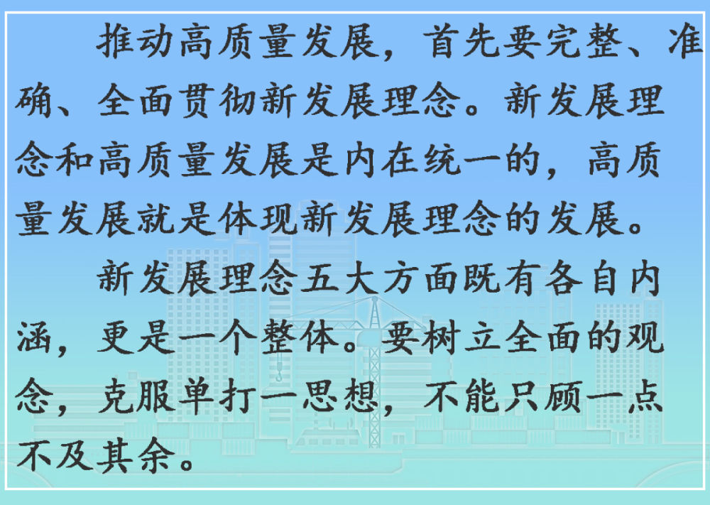 黨的十九屆六中全會審議通過的《中共中央關(guān)于黨的百年奮斗重大成就和歷史經(jīng)驗的決議》指出:“黨中央強調(diào),貫徹新發(fā)展理念是關(guān)系我國發(fā)展全局的一場深刻變革,不能簡單以生產(chǎn)總值增長率論英雄,必須實現(xiàn)創(chuàng)新成為第一動力、協(xié)調(diào)成為內(nèi)生特點、綠色成為普遍形態(tài)、開放成為必由之路、共享成為根本目的的高質(zhì)量發(fā)展,推動經(jīng)濟發(fā)展質(zhì)量變革、效率變革、動力變革。”