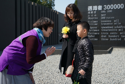 來(lái)自日本的黑田薰是紀(jì)念館的第一位國(guó)際志愿者。1997年,她第一次參觀紀(jì)念館,看著眼前的森森白骨,她開始盡己所能將真相傳播給日本民眾,并在2008年戴上“紫金草”的徽章,成為一名國(guó)際志愿者。