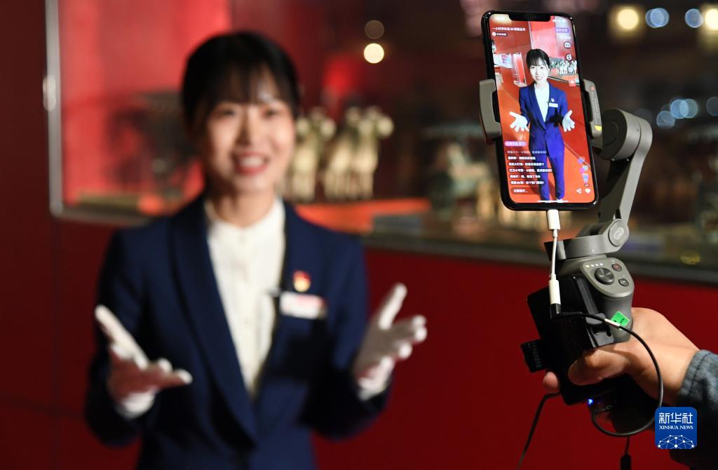 2020年4月30日,在北京汽車博物館,講解員曾紅娟通過網絡直播平臺為觀眾介紹館內的藏品車。新華社記者 任超 攝