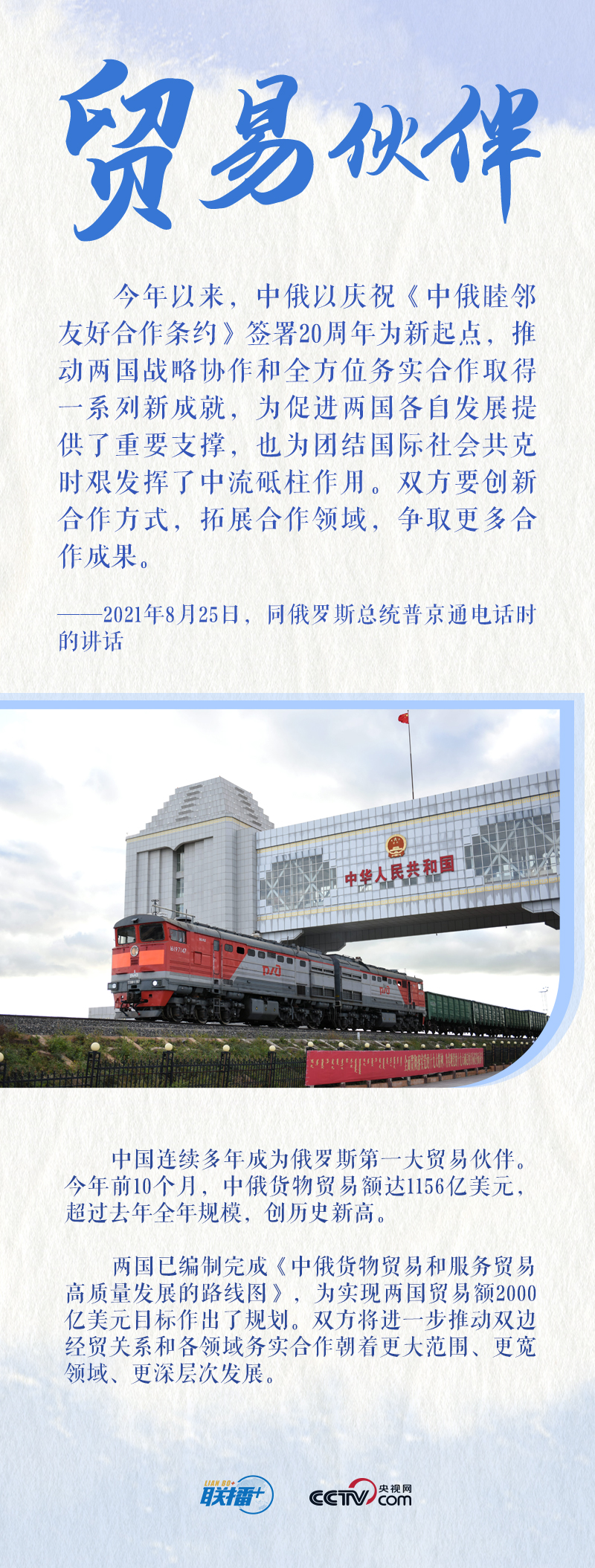 值此中俄“背靠背”戰(zhàn)略協(xié)作和全方位務實合作蓬勃發(fā)展之際,央視網(wǎng)《聯(lián)播+》特梳理習近平主席關于中俄關系發(fā)展的重要論述,與您一起學習。