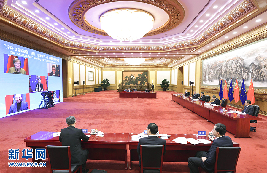12月30日晚,國(guó)家主席習(xí)近平在北京同德國(guó)總理默克爾、法國(guó)總統(tǒng)馬克龍、歐洲理事會(huì)主席米歇爾、歐盟委員會(huì)主席馮德萊恩舉行視頻會(huì)晤。中歐領(lǐng)導(dǎo)人共同宣布如期完成中歐投資協(xié)定談判。 新華社記者 丁林 攝