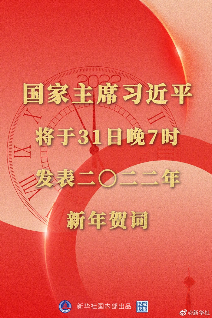 新華社北京12月30日電 國(guó)家主席習(xí)近平將于31日晚7時(shí)通過(guò)中央廣播電視總臺(tái)和互聯(lián)網(wǎng),發(fā)表二〇二二年新年賀詞。中央廣播電視總臺(tái)所屬中央電視臺(tái)綜合頻道、新聞?lì)l道、中文國(guó)際頻道、4K頻道,中國(guó)國(guó)際電視臺(tái)各外語(yǔ)頻道,中央人民廣播電臺(tái),中國(guó)國(guó)際廣播電臺(tái),以及人民網(wǎng)、新華網(wǎng)、央視新聞客戶端等中央主要新聞媒體所屬網(wǎng)站、新媒體平臺(tái)將準(zhǔn)時(shí)播出。