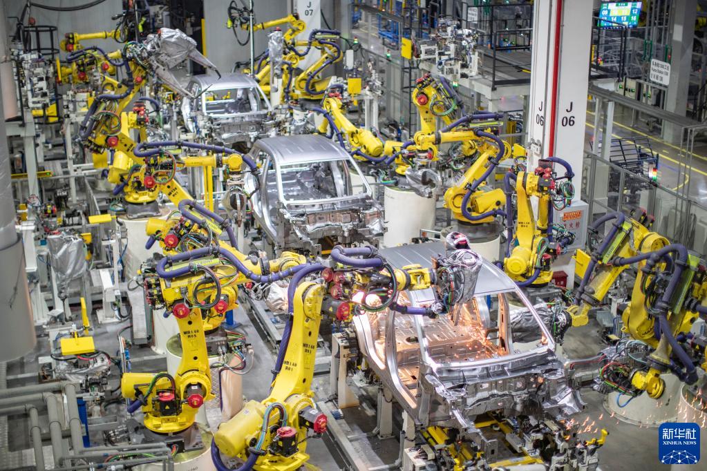 重慶一家新能源汽車企業(yè)使用智能化焊接機器人進行焊接作業(yè)(2021年4月2日攝)。新華社記者 黃偉 攝
