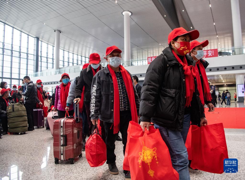 2月16日,返崗務(wù)工人員在重慶西站候車廳排隊前往檢票口,免費(fèi)乘坐復(fù)工專列前往廣東省返崗務(wù)工。新華社記者 唐奕 攝
