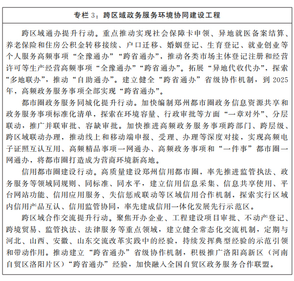 提升政務服務便利度。加快推進政務服務標準化,持續(xù)優(yōu)化《河南省政務服務事項基本目錄》,制定全省統(tǒng)一的政務服務標準化實施細則,全面建成與國家和行業(yè)標準體系協(xié)調一致、結構統(tǒng)一,覆蓋省、市、縣、鄉(xiāng)、村五級的政務服務標準化體系,實現同一事項全省無差別受理、同標準辦理,爭創(chuàng)一批政務服務標準化國家級試點。優(yōu)化再造政務服務流程,持續(xù)壓縮政務服務事項辦理時限,全面推行一窗通辦、一網通辦、全程網辦服務模式,推出一批憑營業(yè)執(zhí)照和居民身份證可自助辦理的“無人審批”事項,推動實現全省除涉密之外的所有政務服務事項實行“不見面審批”、市縣級政務服務事項“一窗”分類受理全覆蓋。“十四五”期間,普通高壓客戶辦電環(huán)節(jié)壓縮至4個以內,其中符合投資至規(guī)劃紅線要求的辦電環(huán)節(jié)壓縮至3個以內,對通過工商信息推送“主動辦電”的辦電環(huán)節(jié)壓縮至2個以內。用水、用氣報裝(含施工)環(huán)節(jié)分別壓縮至2個、3個。精簡辦事材料,全面清理證明事項和推行證明事項告知承諾制,推廣應用以信用為基礎的容缺受理機制,創(chuàng)建一批“無證明城市”。創(chuàng)新政務服務模式,探索無人工干預的智慧審批、“無感智辦”等新模式,逐步拓展“秒報”“秒批”服務事項范圍和“最小顆?;闭辗帐马椄采w面,加快互聯網應用適老化及無障礙改造升級。實施跨區(qū)域政務服務通辦提升行動,聚焦保障改善民生,加快統(tǒng)一通辦業(yè)務規(guī)則和標準,優(yōu)化通辦業(yè)務模式,推動更多政務服務事項“同事同標”,實現企業(yè)和群眾高頻事項“全豫通辦”“跨省通辦”。到2025年,政務服務事項“一網通辦”可辦率、“最多跑一次”實現率均達到100%,出口退稅平均辦理時間壓縮至3個工作日以內,普通高壓客戶辦電(不含配套工程施工)、用水報裝(含施工)、用氣報裝(小型含外線施工)耗時分別壓縮至18個、10個、10個工作日。