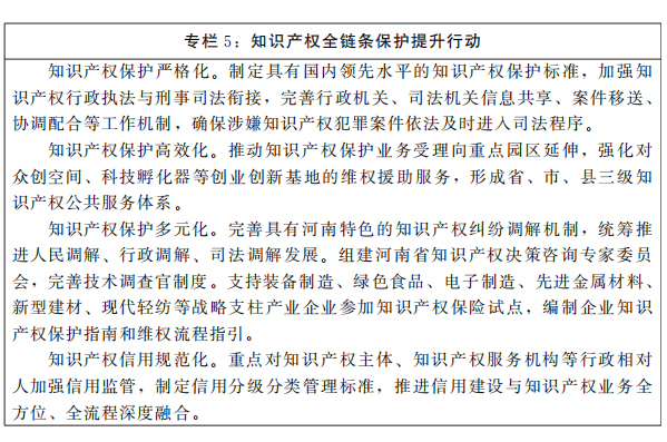 強化知識產權信用建設。完善知識產權保護信用管理制度,加強知識產權領域信用信息歸集共享、信用信息公示、信用分級分類監(jiān)管、信用獎懲和信用修復等環(huán)節(jié)的監(jiān)督管理,提升全社會知識產權保護意識。加強對重點行業(yè)、領域和地方的知識產權保護,維護權利人及社會公眾的合法權益。規(guī)范知識產權領域信用信息歸集,依法依規(guī)將商標搶注和惡意注冊、非正常專利申請等失信行為信息納入信用記錄。發(fā)揮國家技術轉移鄭州中心作用,積極申建國家級知識產權領域以信用為基礎的分級分類監(jiān)管試點,開展省級試點創(chuàng)建,為提高科技成果轉移轉化成效提供良好信用環(huán)境保障。