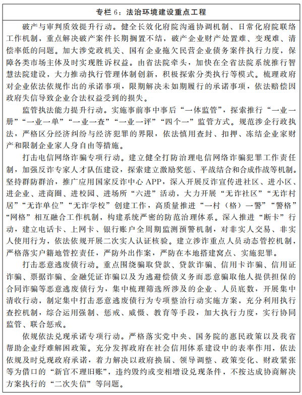 嚴格執(zhí)行保護企業(yè)產權的司法政策,合理劃定責任財產范圍,重點解決國有資產流失、利用公權力侵害私有產權等產權保護中的突出問題。嚴格區(qū)分經濟糾紛與經濟犯罪,依法慎用刑事強制措施,嚴格規(guī)范涉案企業(yè)財產的保全和處置措施。依法平等保護各類市場主體,對企業(yè)負責人少捕慎訴慎押。健全涉企產權冤錯案件有效防范和常態(tài)化糾錯機制,加大企業(yè)產權冤錯案件賠償決定執(zhí)行力度。強化善意文明執(zhí)行理念,嚴禁超標的查封、亂查封,建立健全查封財產融資償債和自行處置機制。加強數字貨幣、網絡虛擬財產、數據等新型權益保護。依法保護股東特別是中小股東的知情權、參與權、收益權、求償權等合法權利。暢通投資者維權渠道,推動加強在線咨詢等工作,加快投資者維權從“線下跑”向“網上辦”轉變。強化上市公司監(jiān)管,提高上市公司透明度。全面開展打擊電信網絡詐騙專項行動,聚焦“抓防范、強治理、降發(fā)案”,升級完善省、市、縣三級反詐中心,注重縣域高發(fā)類案件和大要案件集中攻堅的資源技術支撐,著力構建誠信社會環(huán)境。全面開展打擊惡意逃廢債專項行動,重點打擊騙取貸款、金融憑證詐騙、拒不履行法院判決裁定等違法犯罪行為,努力營造良好金融生態(tài)。全面開展依規(guī)依法兌現承諾專項行動,嚴格落實惠民政策和幫助企業(yè)紓難解困政策,建立健全“政府承諾+社會監(jiān)督+失信問責”機制,重點整治“新官不理舊賬”等政務失信問題。