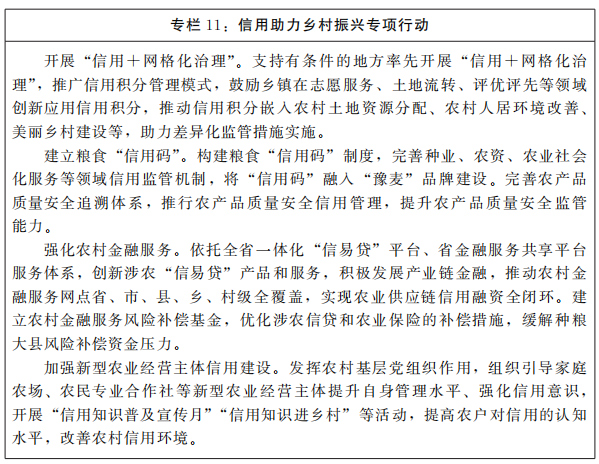 全面推進“信用+鄉(xiāng)村治理”建設,聚焦糧食安全、農村金融、新型農業(yè)經營主體監(jiān)管等領域,創(chuàng)新農村信用應用場景和管理模式。深化農村金融服務改革,健全農村金融服務體系。依據新型農業(yè)經營主體發(fā)展目錄,圍繞信貸融資、行業(yè)監(jiān)管、風險防范、利益聯結等場景建立新型農業(yè)經營主體信用評價體系。