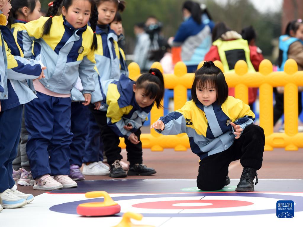 2月16日,安徽省合肥市泰山路幼兒園的小朋友在開(kāi)學(xué)典禮上體驗(yàn)“旱地冰壺”游戲。新華社記者 周牧 攝