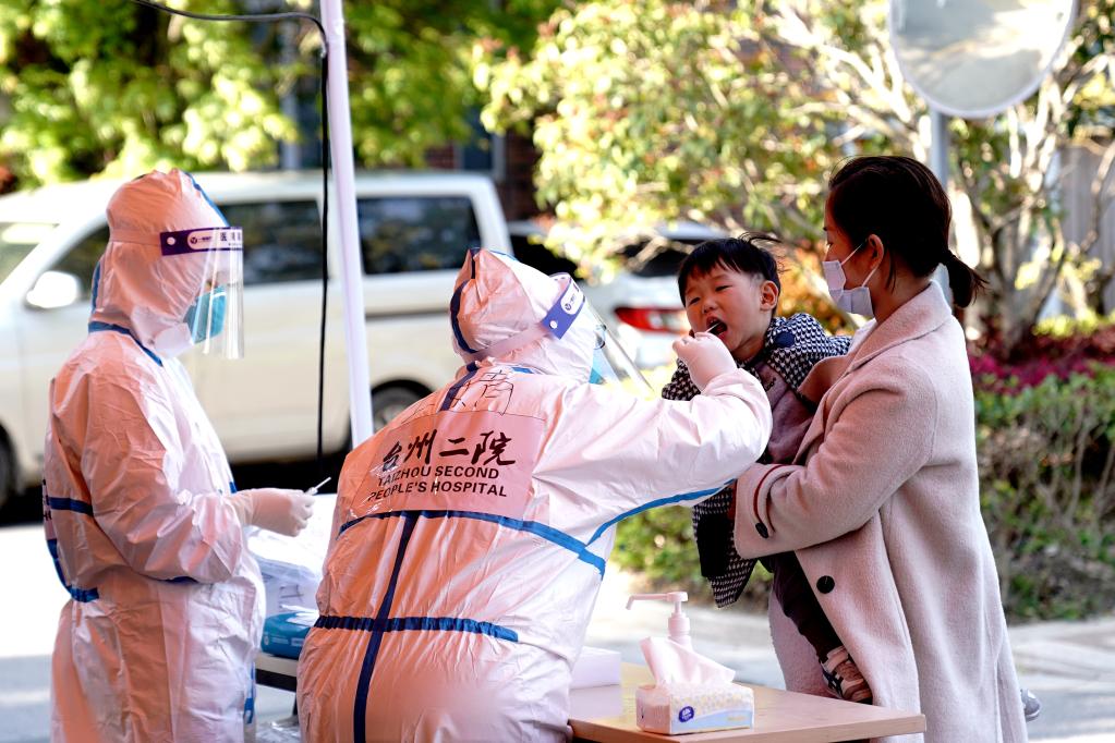 4月4日,在上海松江區(qū)祥欣居民區(qū),浙江援滬醫(yī)療隊隊員為小朋友進行核酸檢測采樣。新華社記者 張建松 攝