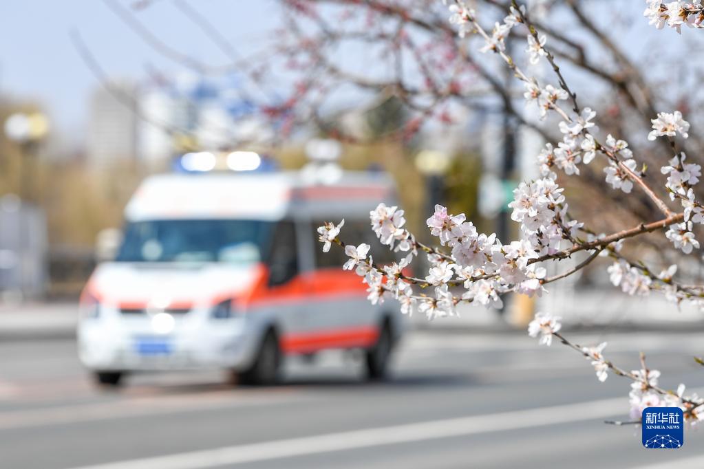 4月14日,一輛救護(hù)車在吉林市松江東路上駛過(guò),路邊桃花已經(jīng)盛開(kāi)。新華社記者 張楠 攝