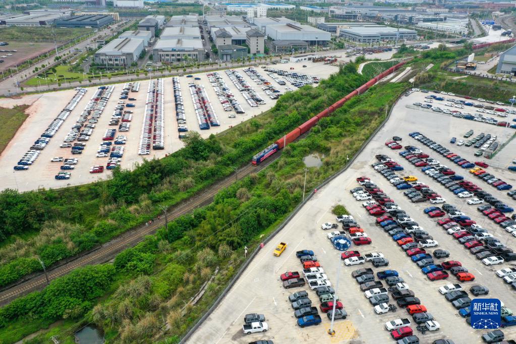 4月14日,長(zhǎng)城汽車專列首發(fā)列車行駛在重慶永川國(guó)家高新區(qū)鐵路專用線上(無(wú)人機(jī)照片)。新華社記者 唐奕 攝