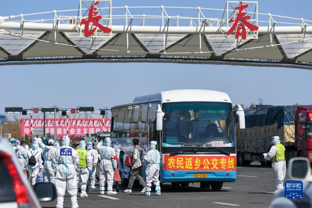 在吉林長(zhǎng)春高速公路東出口,返鄉(xiāng)農(nóng)民登上返鄉(xiāng)公交專線(4月12日攝)。新華社發(fā)