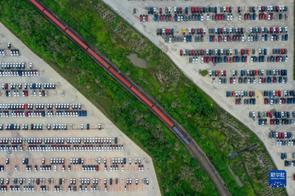 長城汽車專列首發(fā)列車在重慶永川國家高新區(qū)鐵路專用線上(4月14日攝,無人機照片)。新華社記者 唐奕 攝