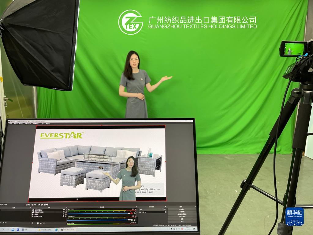 廣州輕工工貿集團紡織品進出口公司員工利用綠幕技術排練廣交會上“云展示”(4月11日攝)。新華社發(fā)(受訪者供圖)