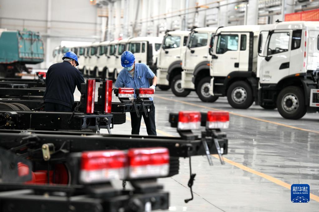在位于石家莊市欒城區(qū)的石家莊煤礦機械有限責任公司車間內,工作人員組裝新能源環(huán)衛(wèi)車(4月12日攝)。新華社記者 李繼偉 攝