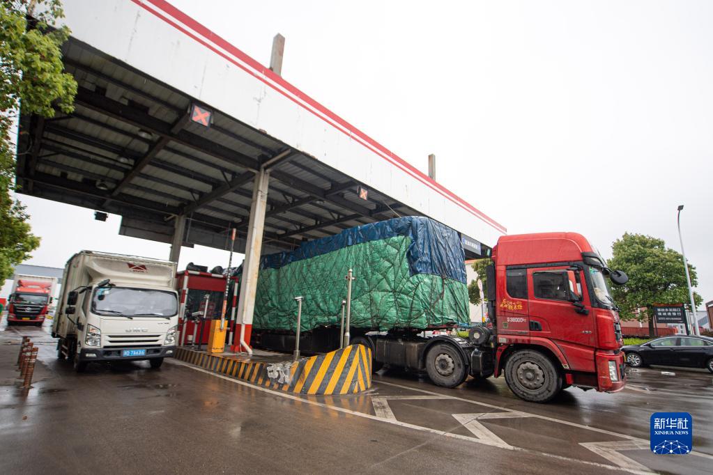 貨車駛入位于杭州市錢塘區(qū)的杭州傳化公路港(4月13日攝)。新華社記者 江漢 攝