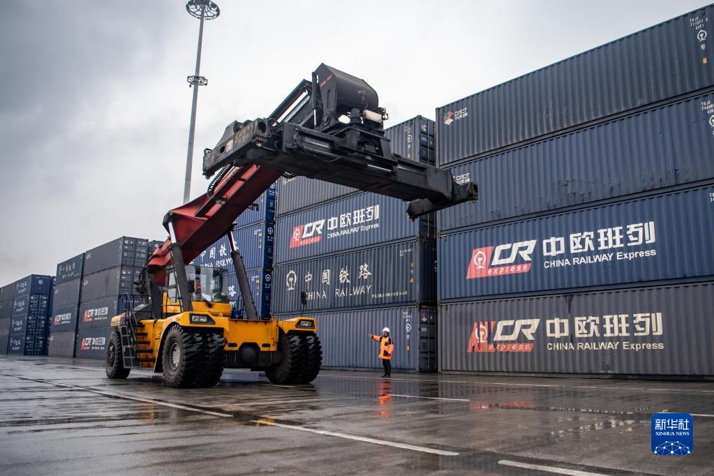 中歐班列起點聯(lián)合巡邏隊成員在重慶團結村中心站貨場對作業(yè)車輛進行現(xiàn)場指揮(1月25日攝)。新華社記者 唐奕 攝